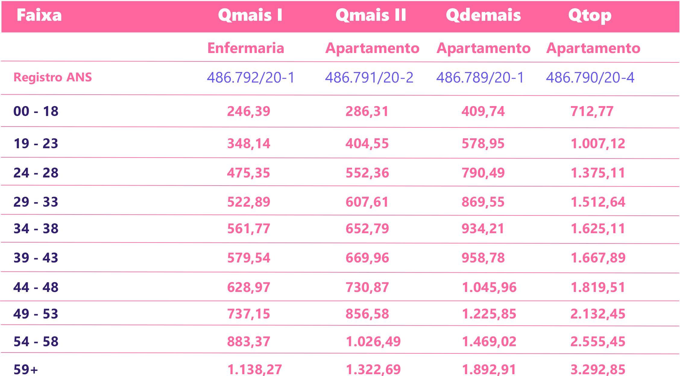 Além dos valores serem bem atrativos, levando em consideração a qualidade da rede de atendimento e os diversos benefícios, você pode escolher a melhor data para o pagamento da sua mensalidade. Confira a tabela de preços do plano Qsaúde abaixo.